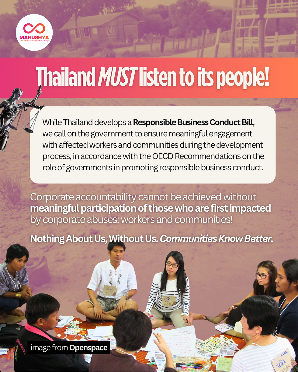 While Thailand portrays itself as a champion on responsible business conduct, we know too well the reality: exploited migrant workers, Indigenous Peoples evicted from their lands, rural communities suffering health issues and environmental contamination like the Phichit Villagers, human rights defenders criminalised. And no justice, no accountability.